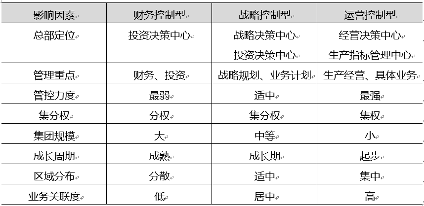 集团管控模式就是企业集团在管理下属企业中的定位,按照集团总部的集分权程度的不同,普遍把集团管控模式分成三种:财务管控型、战略控制型、运营控制型三种管控模式。由于各种影响因素的不同,集团采用的管控模式也不相同。